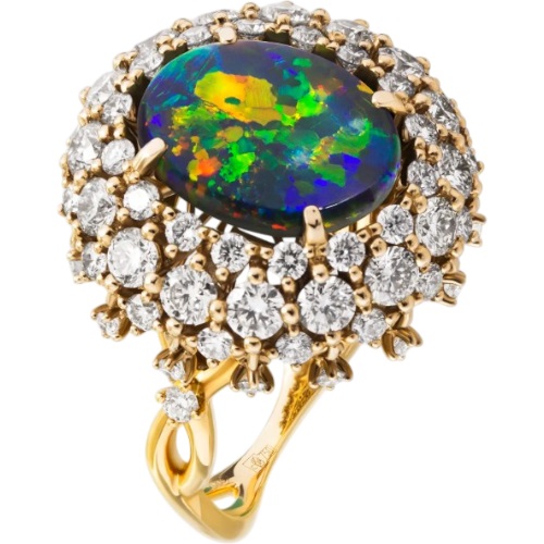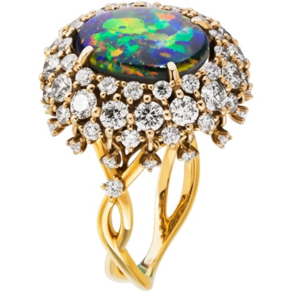 Кольцо из лимонного золота с опалом Арлекин и бриллиантами