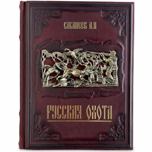 Кожаный переплет, ручная работа, оформление – художественное объемное литьё с изображением сюжета из сцены охоты, золотое фольгированное тиснение и трёхсторонний золотой обрез.